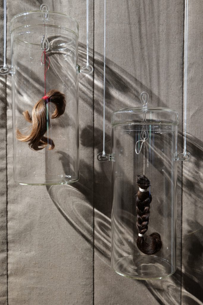 Bei jedem Menschen spiegeln die Haare im Laufe eines Lebens die ganz individuelle Entwicklung. Sie markieren große und kleine Veränderungen. Sie sind Informationsspeicher und persönliches Erscheinungsbild. Vier Lebensphasen der Künstlerin sind stellvertretend für andere menschen in den Glasbehältern konserviert. Die leeren Gefäße geben Raum für kommende Lebensabschnitte.