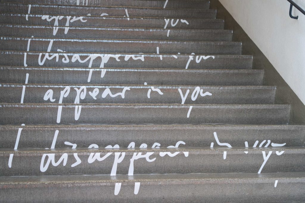 Je nach Standpunkt ist die Treppenbeschriftung „I appear in you / I disappear in you“ lesbar oder fragmentarisch. Wer oder was erscheint und wieder verschwindet bleibt offen. Ist es ein Gedanke, ein Gefühl, ein Satz oder die Schrift selbst?